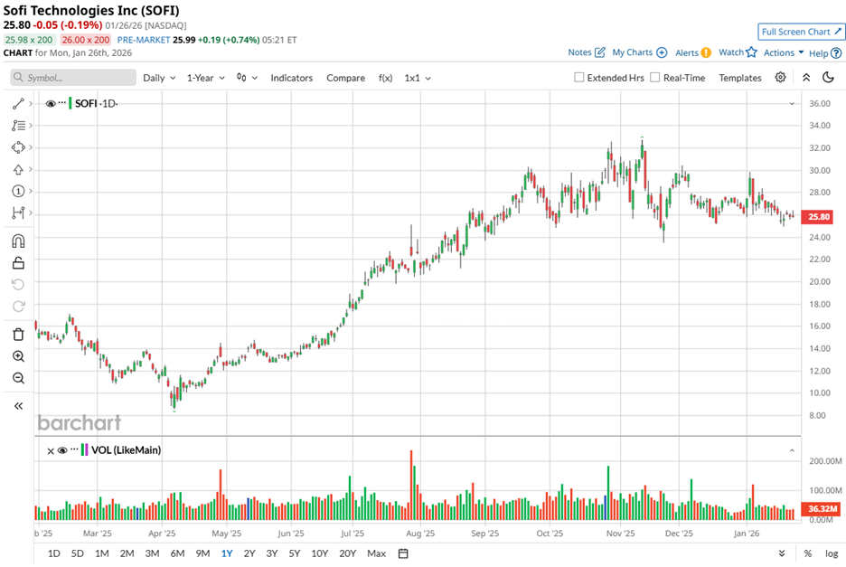 Still, the stock’s journey has not been smooth. Over the past 52 weeks, SoFi’s shares gained nearly 58.33%. The strength carried into a 20% rise over six months before plunging 5.95% in the past month as valuation discipline returned.