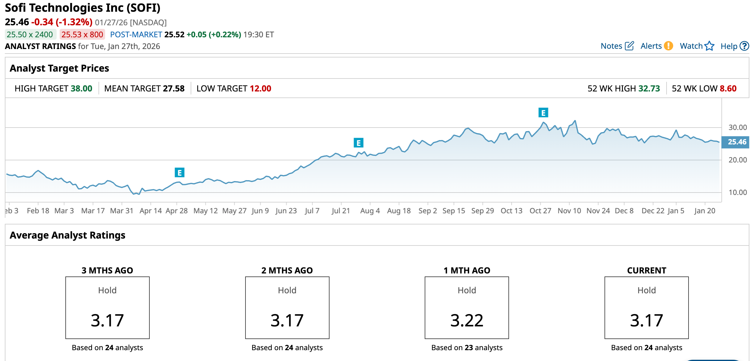 Wall Street, however, remains measured. SOFI stock currently carries an overall rating of “Hold.” Among 24 analysts, five rate it “Strong Buy,” two suggest “Moderate Buy,” 12 recommend “Hold,” two lean toward “Moderate Sell,” and three have assigned a “Strong Sell.”