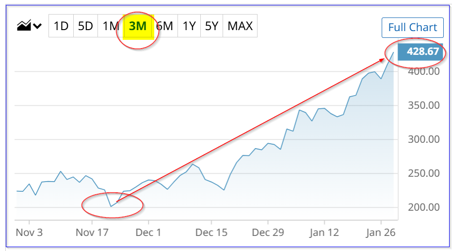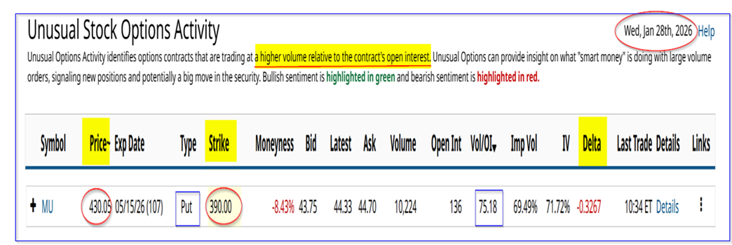 MU is at $430.28 in midday trading, up another 4.89%. MU stock hit a low of $201.37 on Nov. 20, 2025, so it's now up 114% in just over 2 months. That could explain why there is large put option activity today.