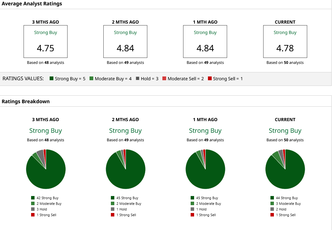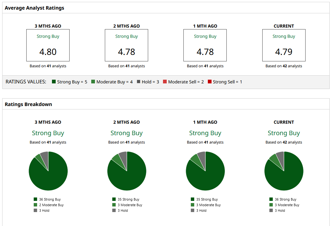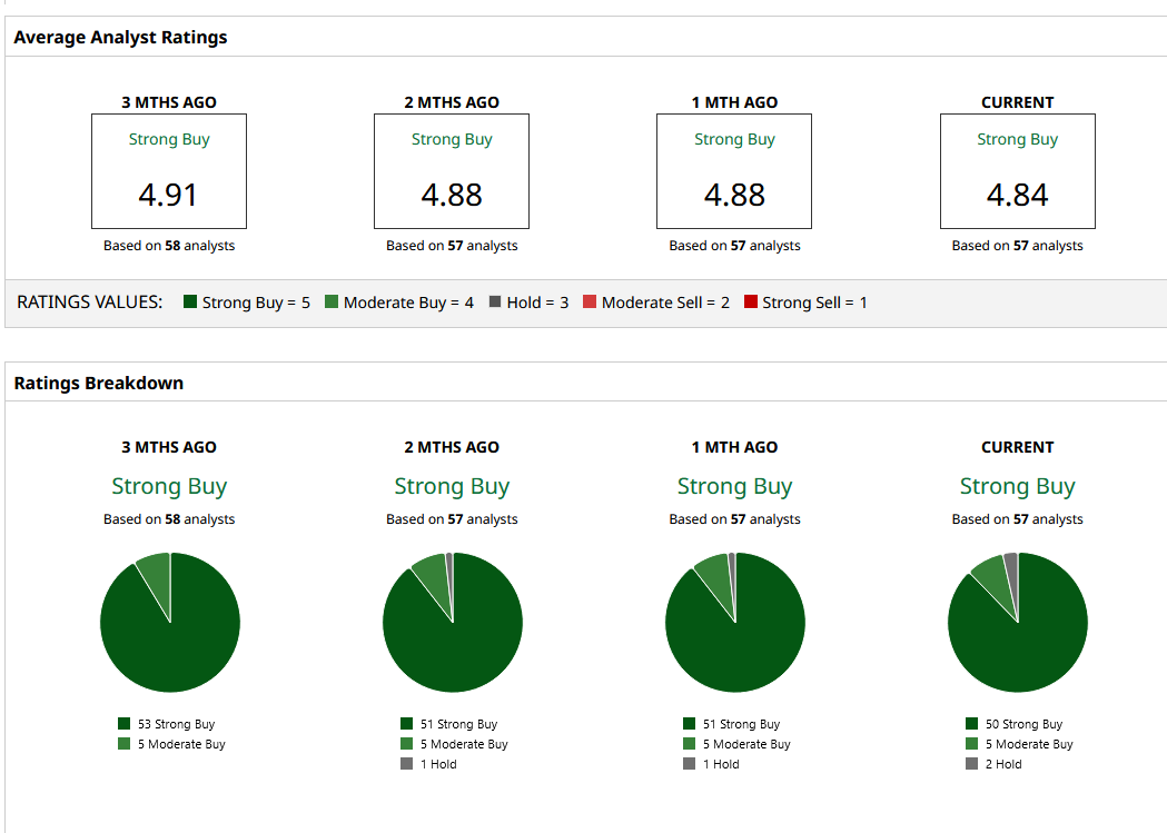 Analysts are extremely bullish on AVGO stock, with 36 “Strong Buy” ratings and a median target price of $455.22, which still offers 38% upside from here on. The highest price target of $535 offers 63% upside from current levels. This analyst sentiment has stayed consistent over the past three months and is unlikely to change considering how vital the company is to building AI infrastructure.