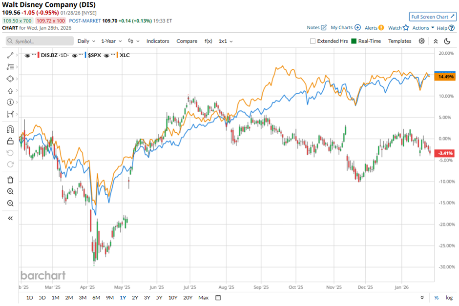 Shares of the Burbank, California-based company have lagged behind the broader market over the past 52 weeks. DIS stock has dropped 2.3% over this time frame, while the broader S&P 500 Index ($SPX) has returned 15%. In addition, shares of the company are down 3.7% on a YTD basis, compared to SPX’s 1.9% rise.