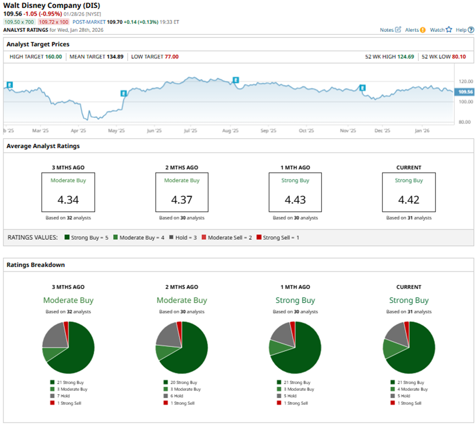 With a market cap of $197.5 billion, The Walt Disney Company (DIS) is a global entertainment leader operating across the Americas, Europe, and the Asia Pacific through its Entertainment, Sports, and Experiences segments. It creates and distributes film, television, streaming, sports content, and immersive experiences through iconic brands, platforms, and theme parks worldwide.