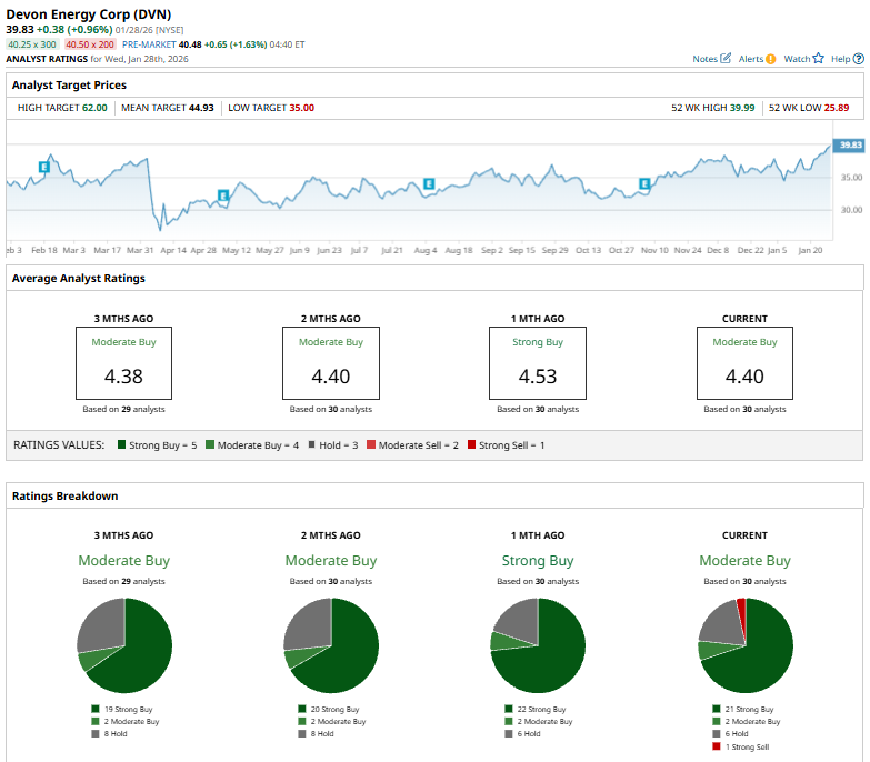 DVN holds a consensus “Moderate Buy” rating overall, supported by 21 “Strong Buys,” two “Moderate Buys,” six “Holds,” and one “Strong Sell” among 30 covering analysts.