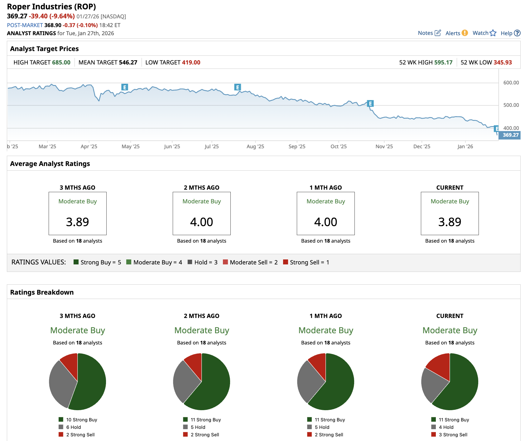 Out of the 18 analysts covering ROP stock, 11 recommend “Strong Buy,” four recommend “Hold,” and three recommend “Strong Sell.” The average ROP stock price target is $546.27, above the current price of $369.