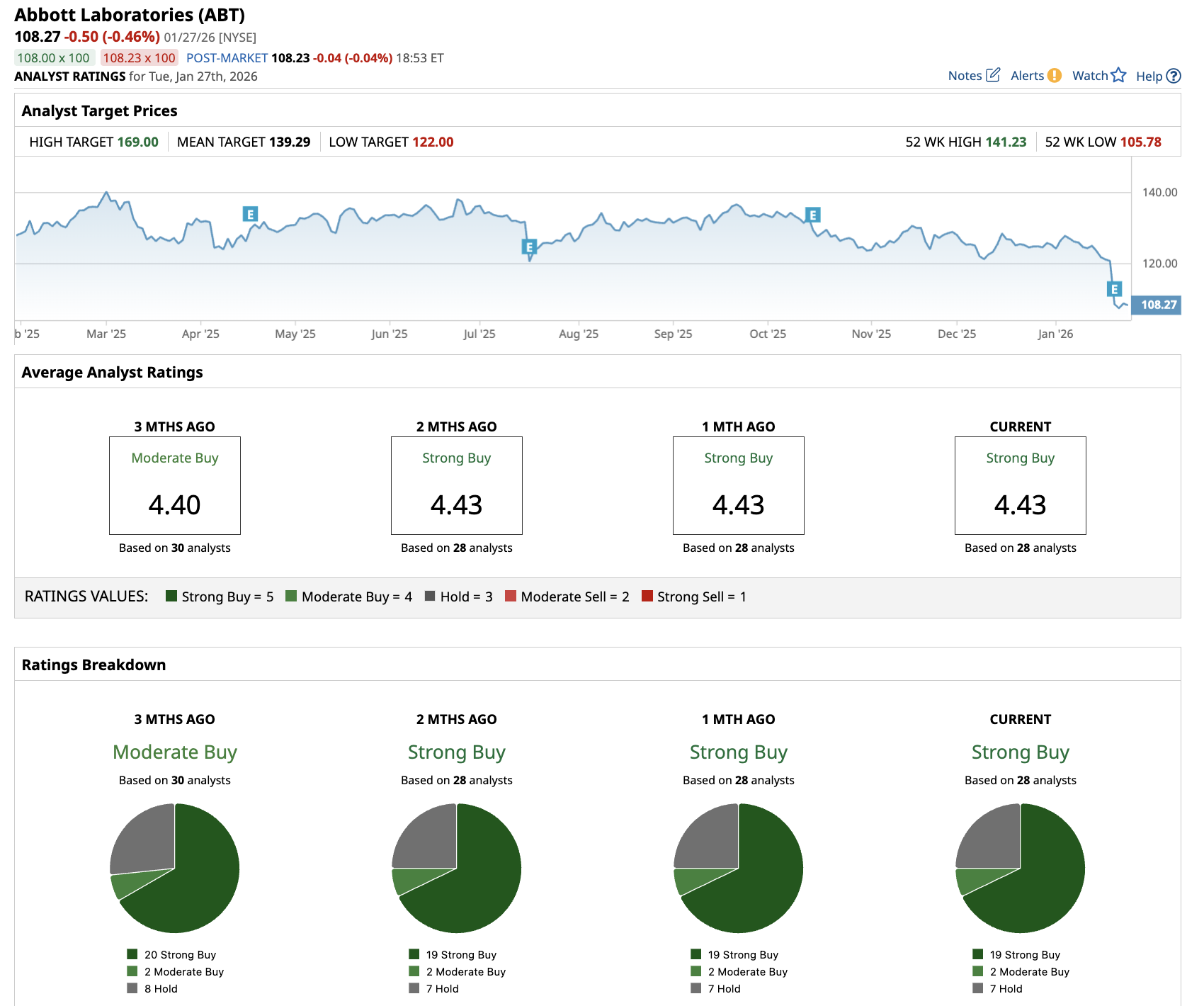 Out of the 28 analysts covering ABT stock, 19 recommend “Strong Buy,” two recommend “Moderate Buy,” and seven recommend “Hold.” The average ABT stock price target is $139.29, above the current price of $108.