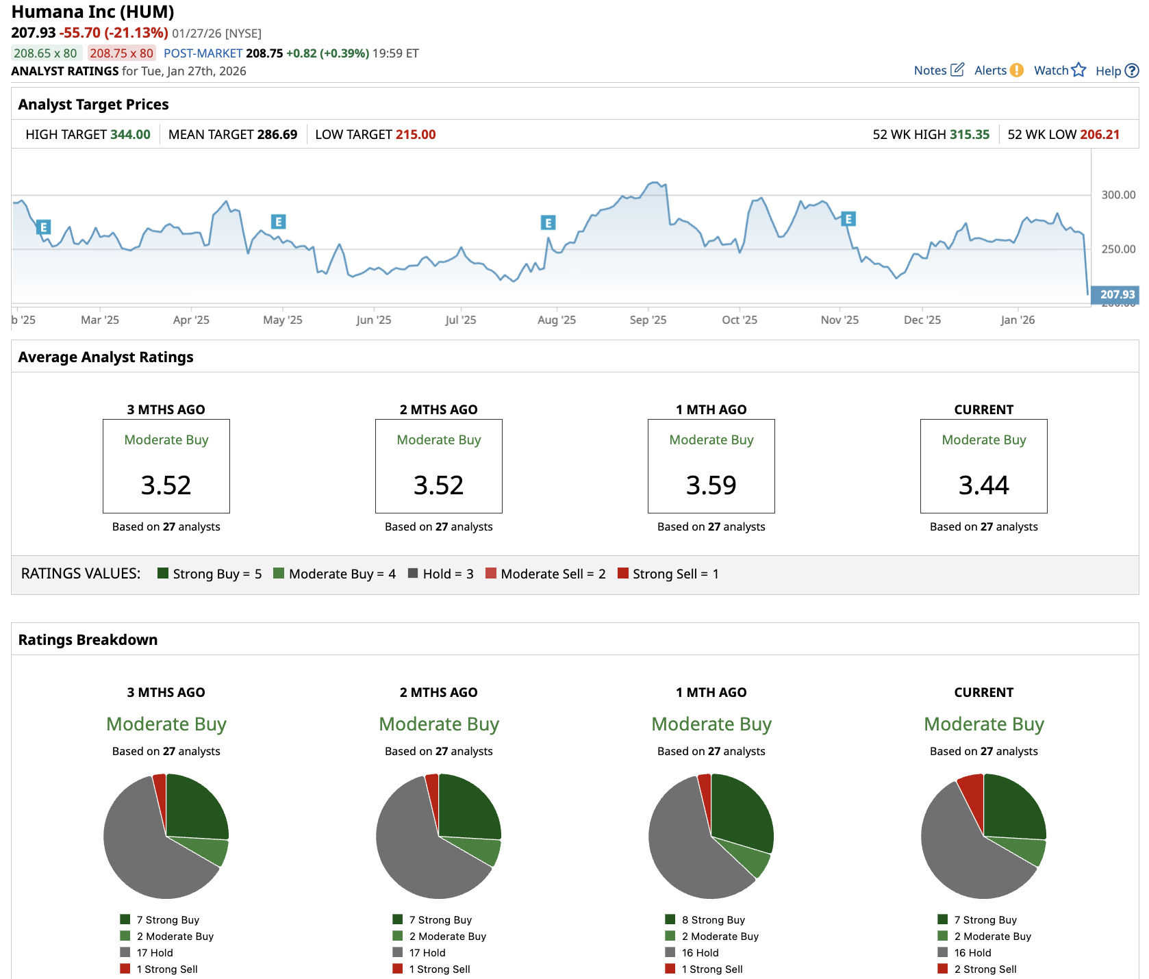 Out of the 27 analysts covering Humana stock, seven recommend “Strong Buy,” two recommend “Moderate Buy,” 16 recommend “Hold,” and two recommend “Strong Sell.” The average HUM stock price target is $287, above the current price of $208.