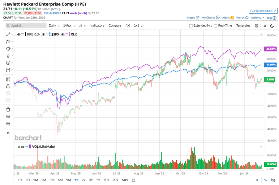 Shares of this global technology leader have underperformed the broader market over the past year. HPE has gained 1.2% over this time frame, while the broader S&P 500 Index ($SPX) has rallied nearly 15%. In 2026, HPE stock is down 9.6%, compared to SPX’s 1.9% rise on a YTD basis.