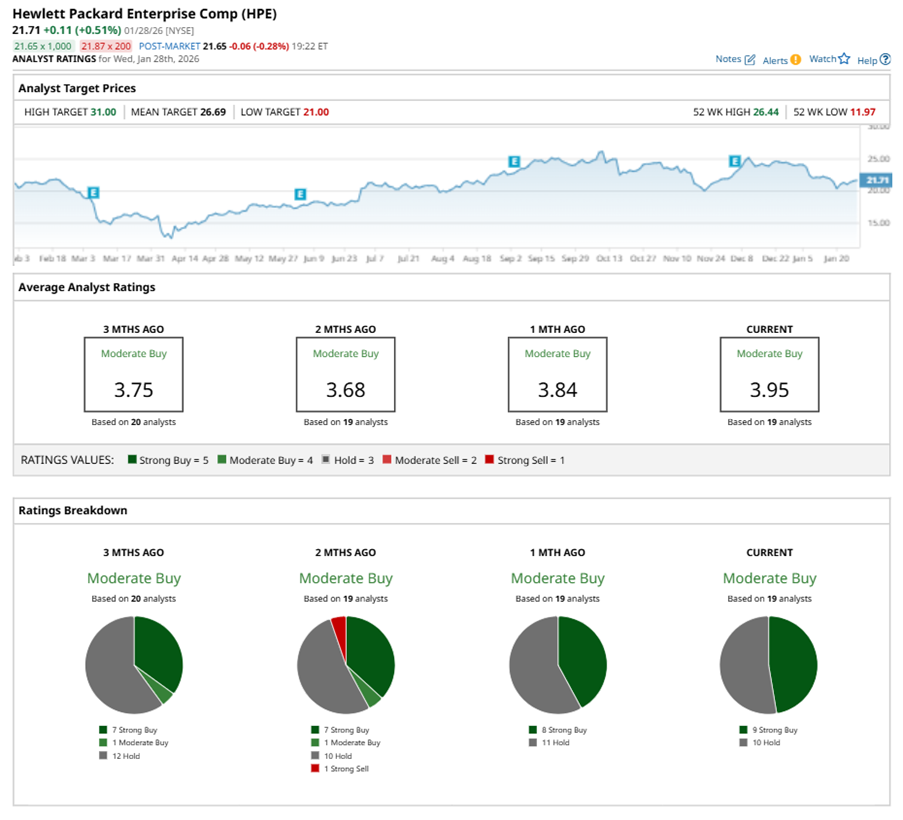 Among the 19 analysts covering HPE stock, the consensus is a “Moderate Buy.” That’s based on nine “Strong Buy” ratings, and 10 “Holds.”