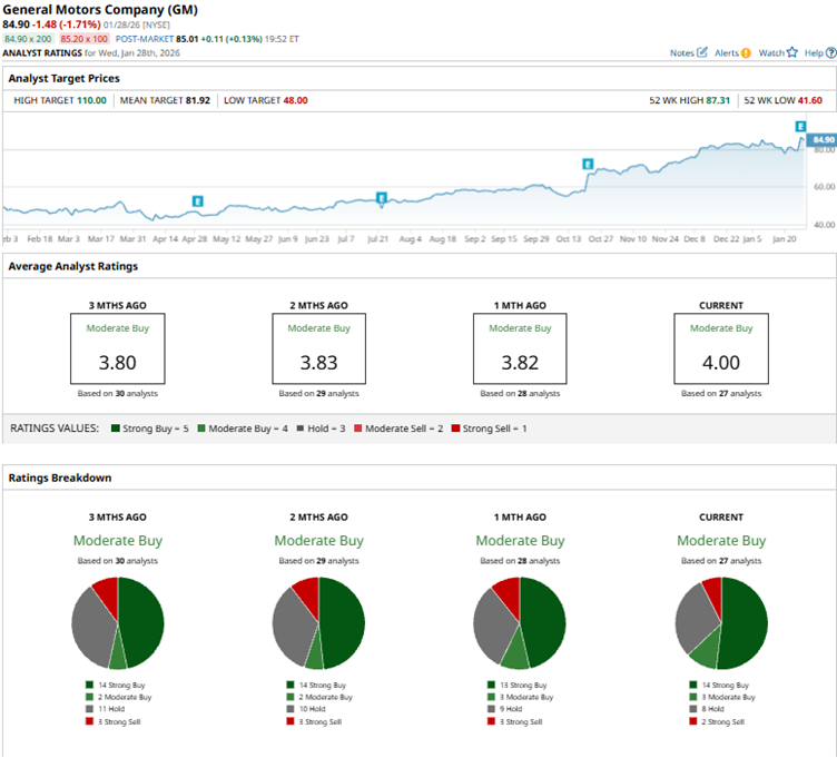 Among the 27 Wall Street analysts covering General Motors’ stock, the consensus is a “Moderate Buy.” That’s based on 14 “Strong Buy” ratings, three “Moderate Buys,” eight “Holds,” and two “Strong Sells.” The ratings configuration is more bullish than it was a month ago, with 14 “Strong Buy” ratings now, up from 13.