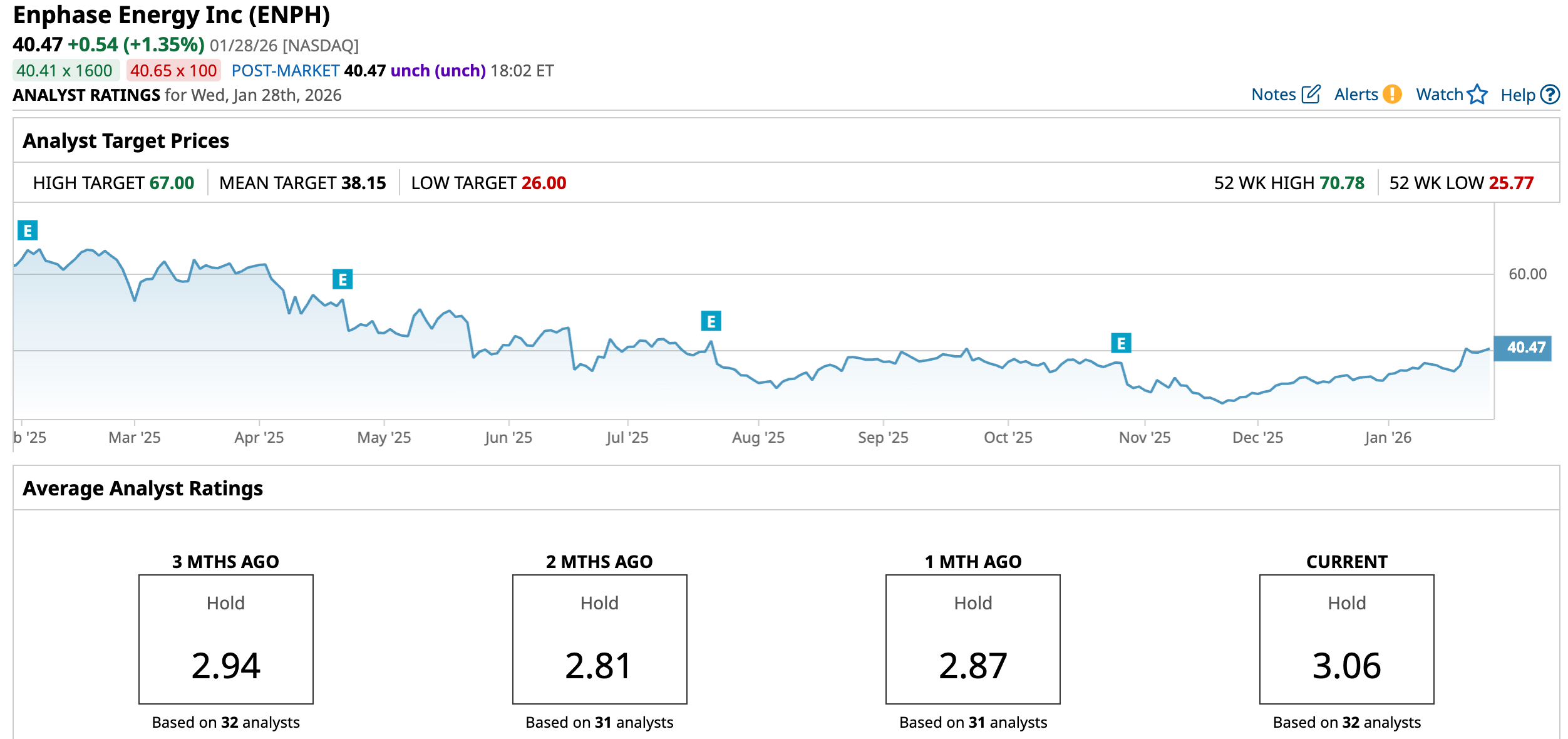 Wall Street’s take on Enphase is a bit of a mixed bag right now. Analysts are feeling reasonably optimistic about the near term, with revenue expected to land around $338.8 million in Q4 and quarterly EPS pegged at about $0.20. For full-year 2025, profits are projected to grow 46.5% YOY to $1.48. But the tone shifts when we look further ahead. In fiscal 2026, profit is expected to cool off meaningfully, with EPS forecast to slide nearly 48% annually to around $0.77, highlighting how uneven the road ahead could be.