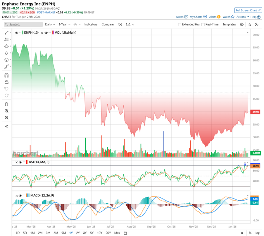 Technically, Enphase is showing clear signs of revival. Volume has expanded alongside the rally, signaling conviction rather than a thin bounce. The 14-day RSI of 71.62 has pushed into overbought territory, reflecting strong momentum even as near-term consolidation would be healthy.