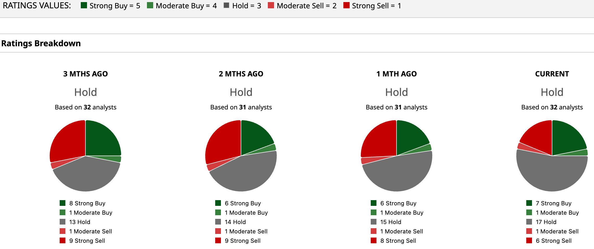 Overall, analysts are cautious on ENPH stock, giving a consensus “Hold” rating. Of the 32 analysts rating the stock, seven analysts rate it a “Strong Buy,” one suggests a “Moderate Buy,” a majority of 17 analysts are playing it safe with a “Hold” rating, one has a “Moderate Sell," and the remaining six are outright skeptical with a “Strong Sell” rating.