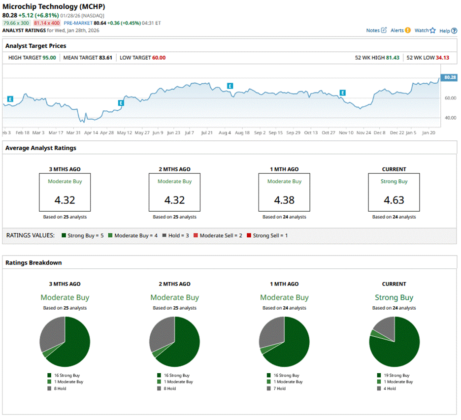 MCHP has a consensus “Strong Buy” rating overall, an upgrade from a “Moderate Buy” rating. Of the 24 analysts covering the stock, opinions include 19 “Strong Buys,” one “Moderate buy,” and four “Holds.”