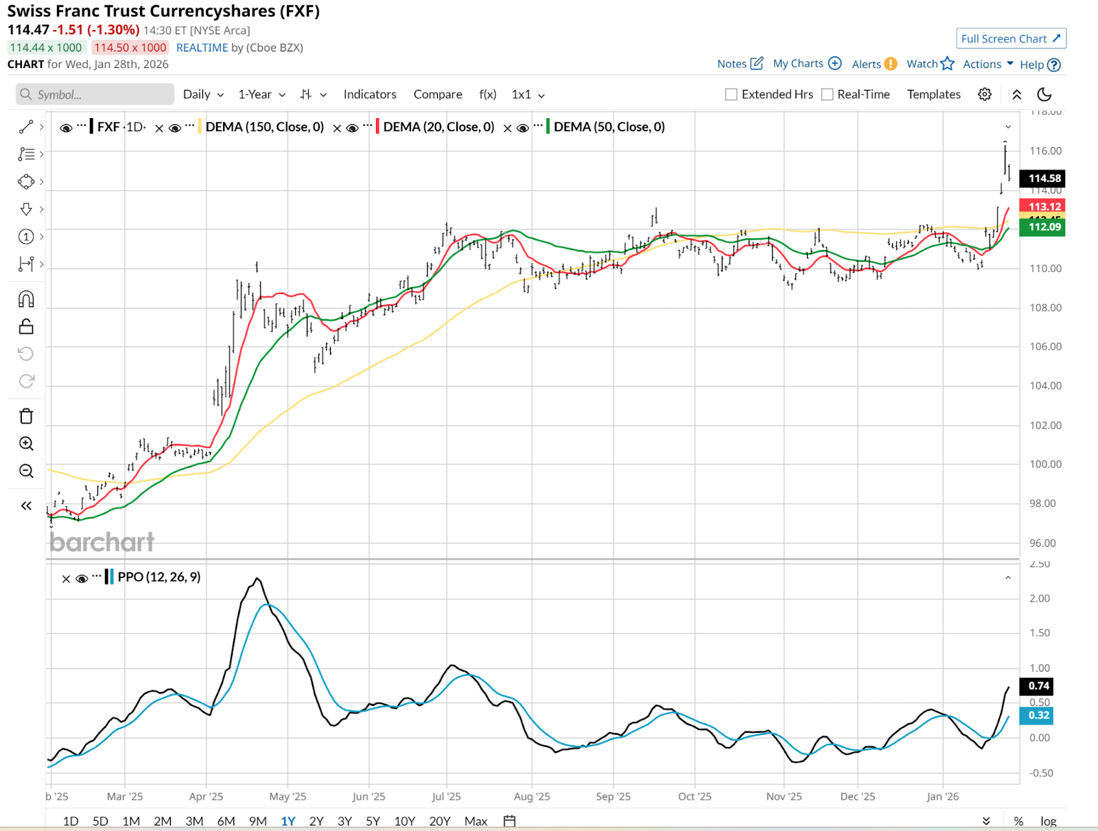 Because the U.S. dollar, despite being the go-to currency for decades, has been on a very slippery slope for a long time. And it just got even more slippery. The dollar is sliding, the Japanese yen is waking up, and the FXF, which tracks the standalone currency of the nation famous for neutrality, is surging toward levels we haven't seen in over a decade.