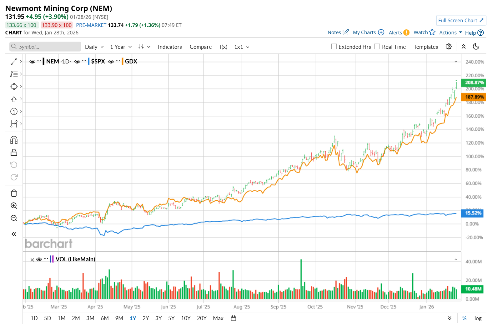 Zooming in further, NEM has also outperformed the VanEck Gold Miners ETF (GDX), which rose 197.5% over the past 52 weeks and 30.8% on a YTD basis.