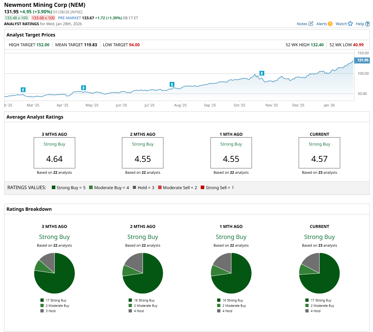 On Jan. 28, NEM shares climbed 3.9% as gold prices surged more than 3% to a fresh all-time high. The sharp rise in bullion prices boosted investor optimism around the miners’ earnings potential, cash flows, and margins, since higher gold prices directly improve revenue realization for producers like Newmont.