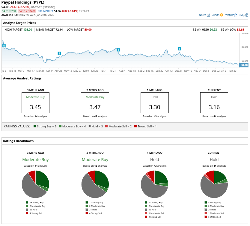 Although the stock has fallen significantly in recent months, investors should take caution ahead of the Q4 earnings release. Analysts maintain a “Hold” consensus rating on PYPL stock ahead of Q4 earnings.
