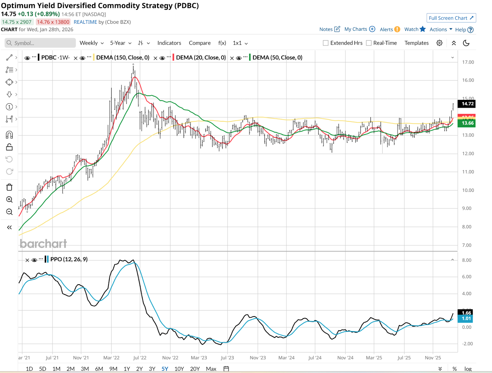 PDBC is currently sitting near multi-year highs, driven by a powerful confluence of macro factors. As of late January 2026, the fund has posted a year-to-date gain of over 6%, building on a robust performance throughout 2025. More importantly to me, that chart above is one that is, shall we say, “priced to move.” It looks higher, at least toward $17. When I see a chart with a rising PPO, 20-week moving average positive, and room to hit its former high, I inch up in my chair.