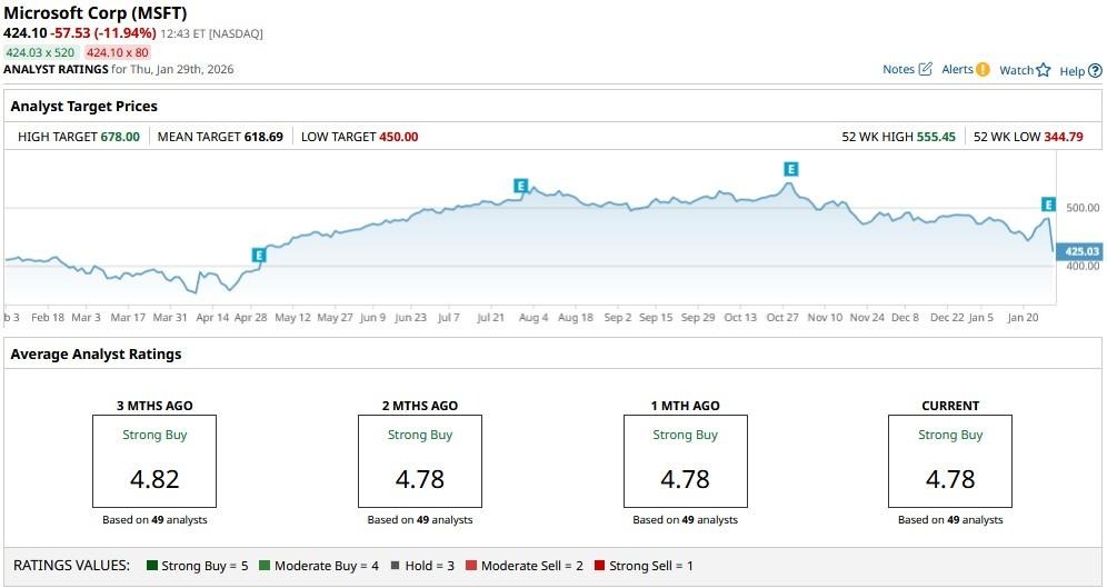 The consensus rating on MSFT shares remains a “Strong Buy,” with the mean target of about $619 indicating potential upside of more than 45% from here.