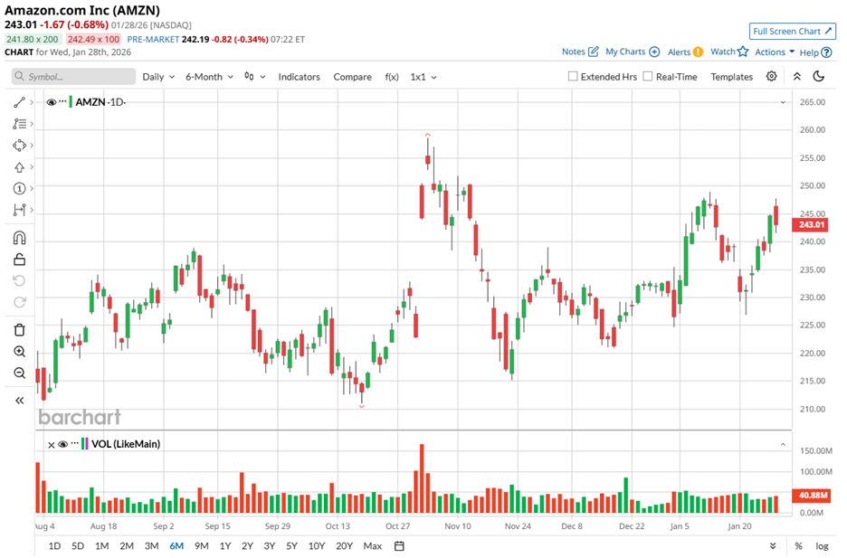 The e-commerce giant is scheduled to release its Q4 2025 results on Thursday, Feb. 5, after market close. Analysts expect quarterly EPS growth of 6.5% YOY to $1.98. For full-year 2025, EPS is projected to jump 29.8% to $7.18, followed by another 10% increase in fiscal 2026 to $7.90.
