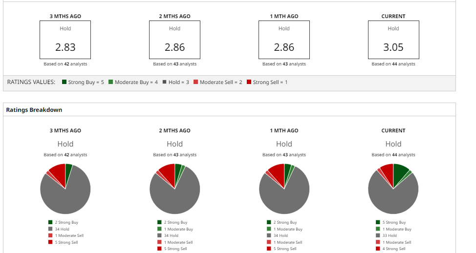 Overall, analyst consensus remains a cautious “Hold” with an average target of around $44, which implies around an 8% downside risk.