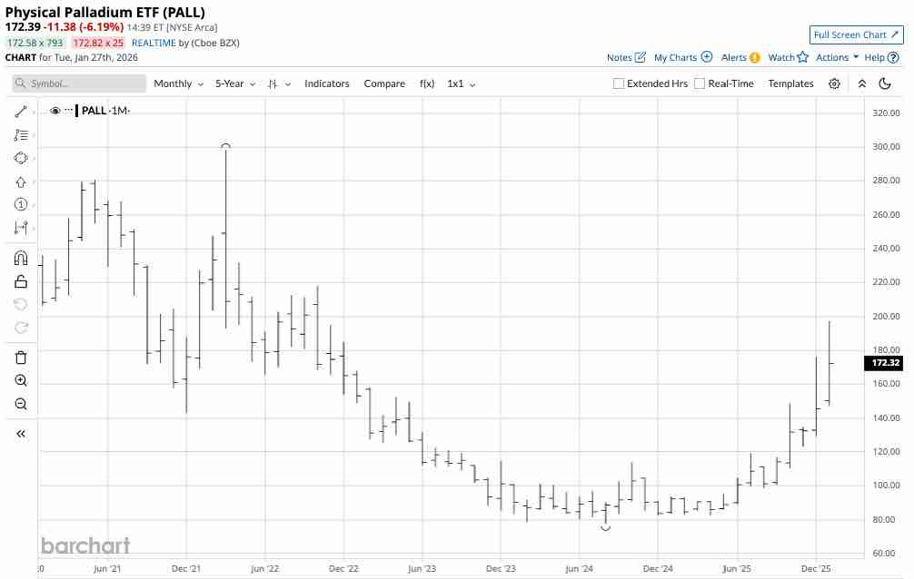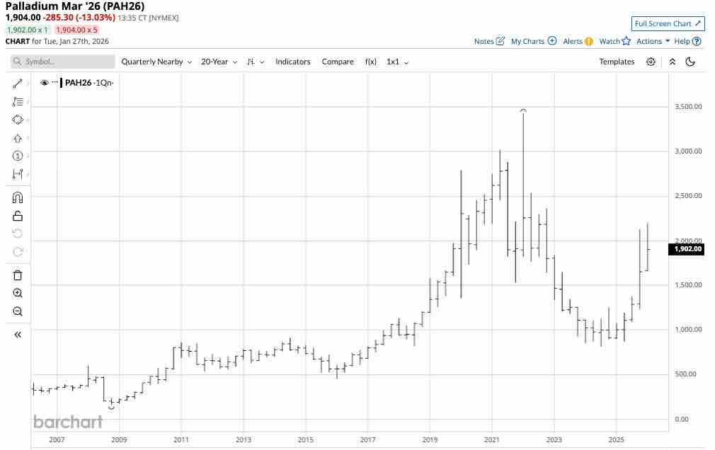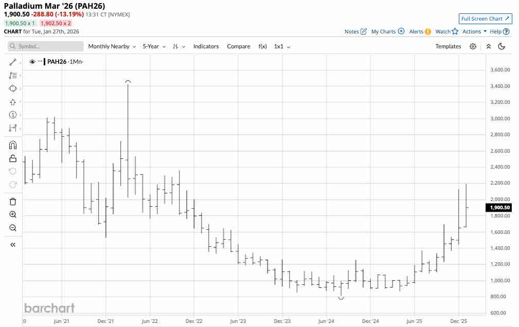 The monthly chart shows that nearby NYMEX palladium futures have rallied in early 2026 and were trading above $1,900 per ounce on January 27 after reaching a high of nearly $2,200 per ounce.