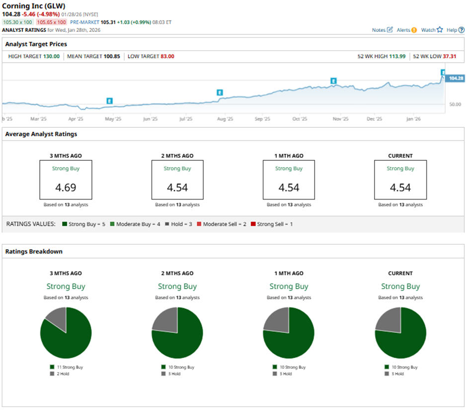 Even after its big run, analysts still see room for gains. While the stock is already trading above the average price target of $100.85, the Street-high target of $130 suggests there could still be about 25% upside from current levels, a sign that many believe Corning’s AI-driven growth story is far from over.