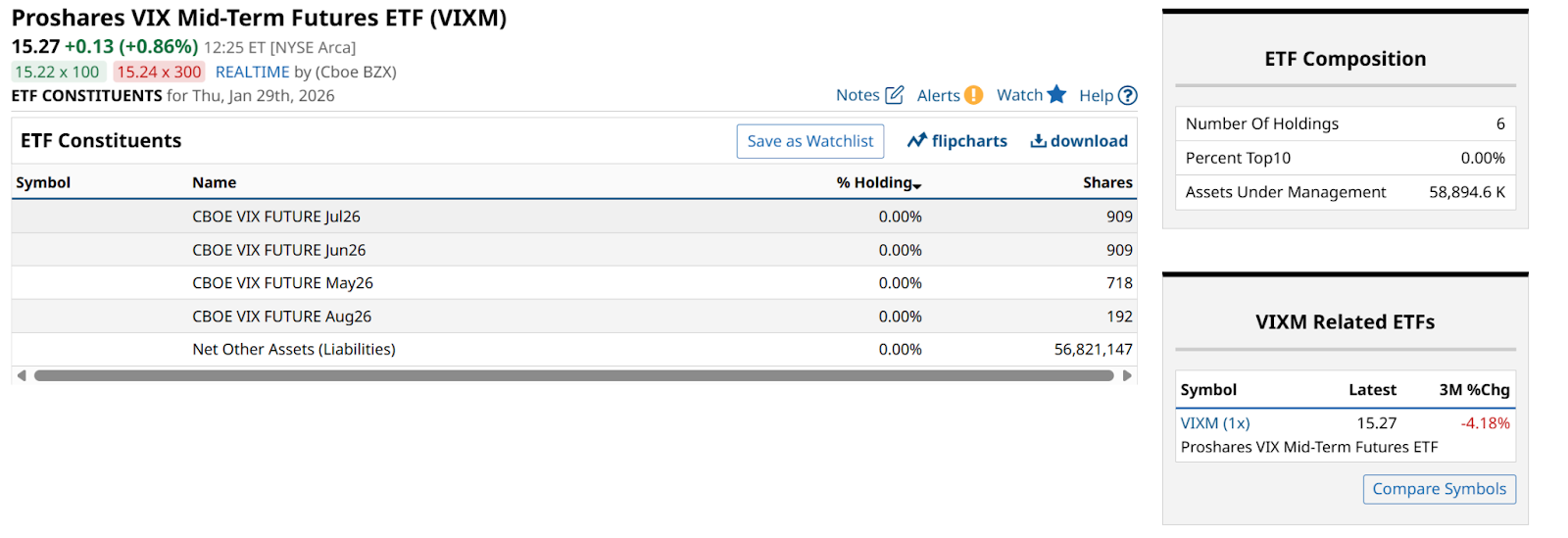 VIXM, by contrast, holds futures contracts further out on the curve (currently including May, June, and July 2026 contracts), where the price curve is much flatter. This significantly reduces the cost of holding the hedge, allowing it to sit in a portfolio for months rather than days.