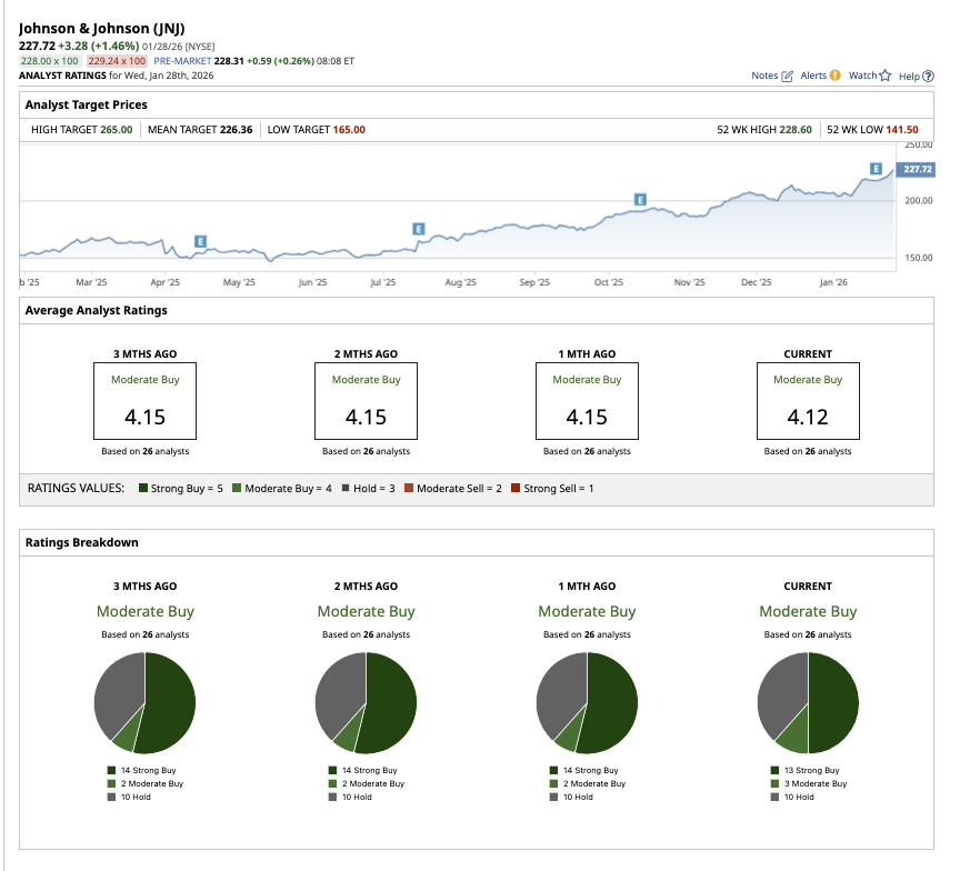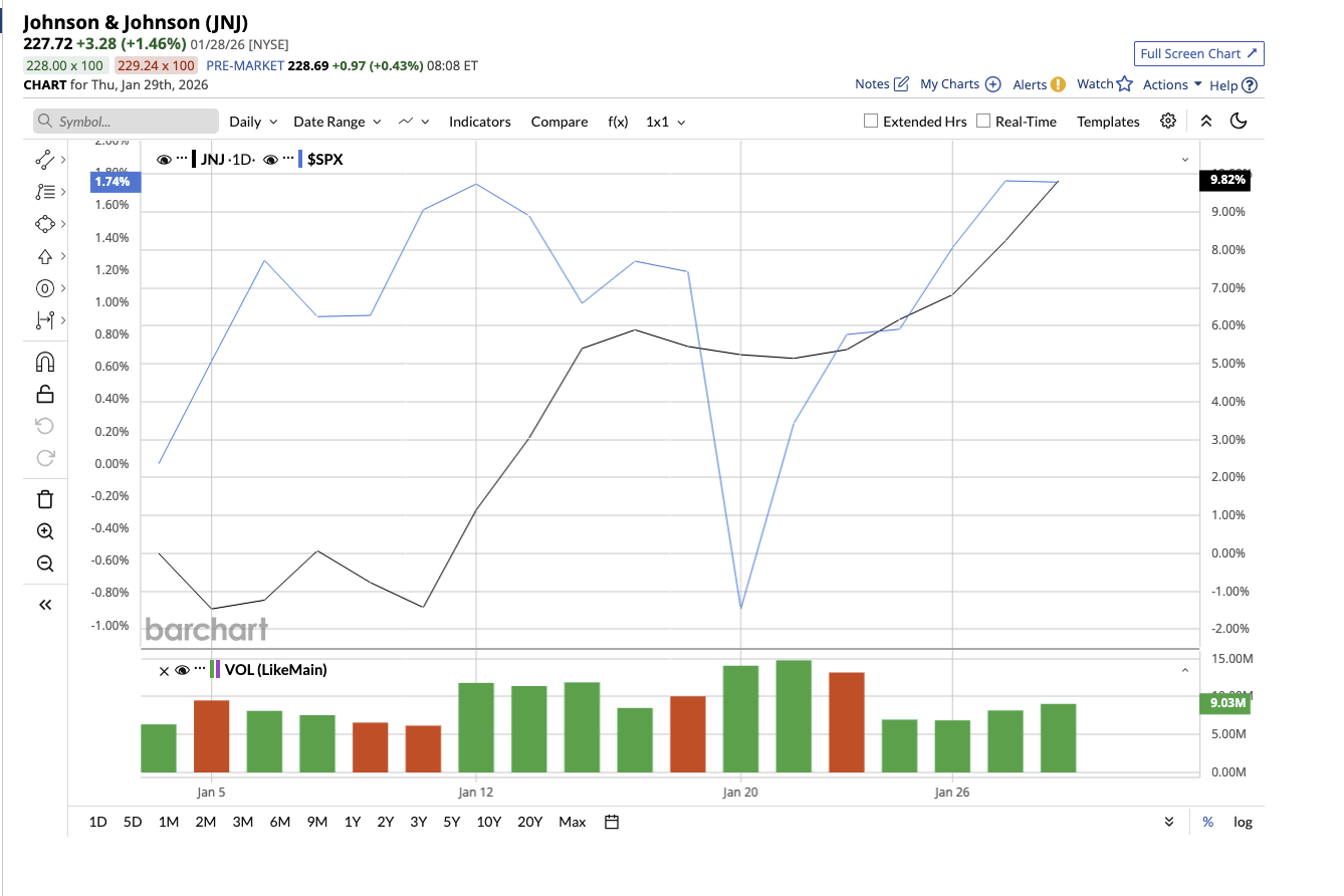 Although J&J is not a high-flying growth stock, it quietly outpaced the market last year. JNJ stock soared 43.7%, compared to the market’s overall gain of 16.6%. One month into 2026, the stock is up more than 10%, surpassing the S&P 500 Index ($SPX).