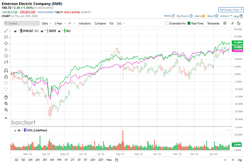 Shares of this industrial heavyweight have outperformed the broader market over the past year. EMR has soared 17% over this time frame, while the broader S&P 500 Index ($SPX) has rallied 15.4%. However, over the past six months, Emerson Electric stock rose 2.1%, trailing the SPX’s 9.4% return.