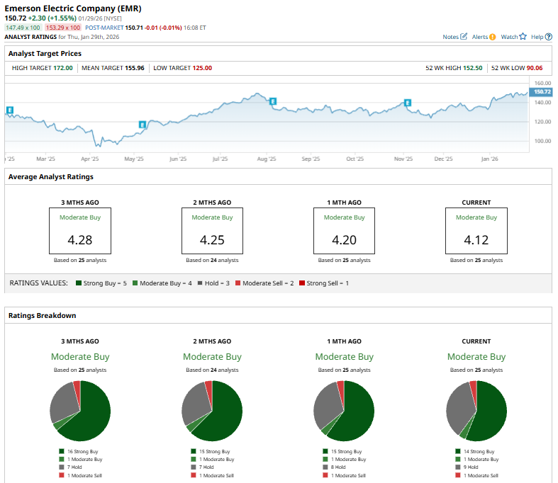 Among the 25 analysts covering the EMR stock, the consensus rating is a “Moderate Buy.” That’s based on 14 “Strong Buys,” one “Moderate Buy,” nine “Holds,” and one “Moderate Sell.”