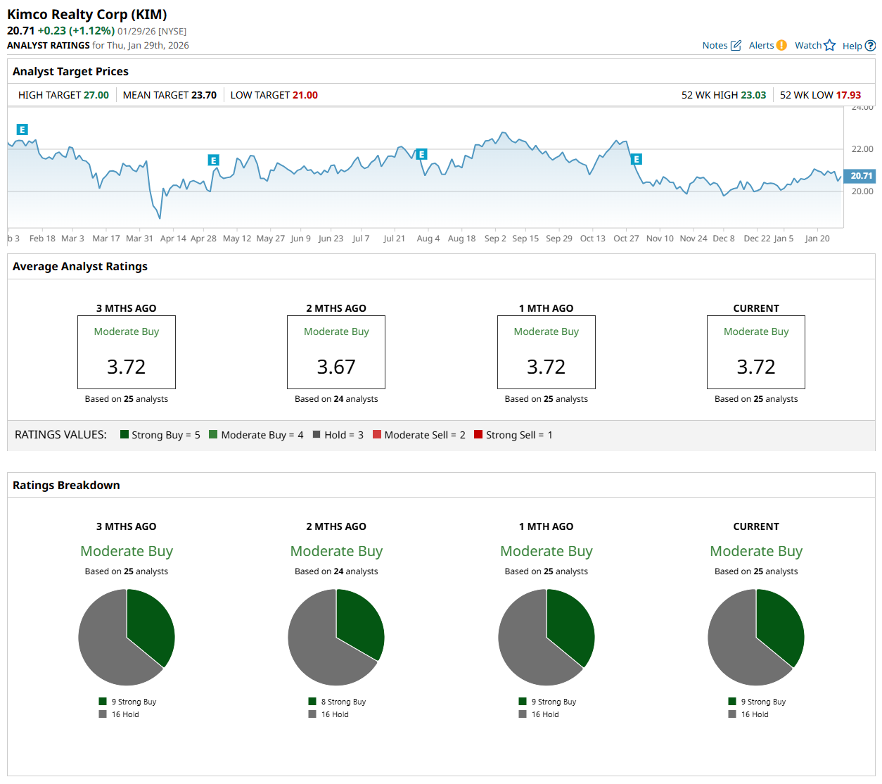 On Jan. 20, Truist Financial Corporation (TFC) analyst Ki Bin Kim maintained a "Hold" rating on KIM, but lowered its price target to $22, indicating a 6.2% potential upside from the current price levels.