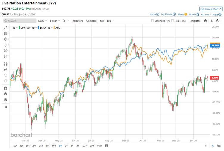 Live Nation Entertainment’s stock has risen due to strong underlying demand for live concerts and events, robust ticket sales growth, and optimistic outlooks on live entertainment trends. However, LYV has underperformed the broader market because of earnings misses, cost pressures from expanded operations, and regulatory and macroeconomic headwinds that make discretionary spending stocks more volatile.