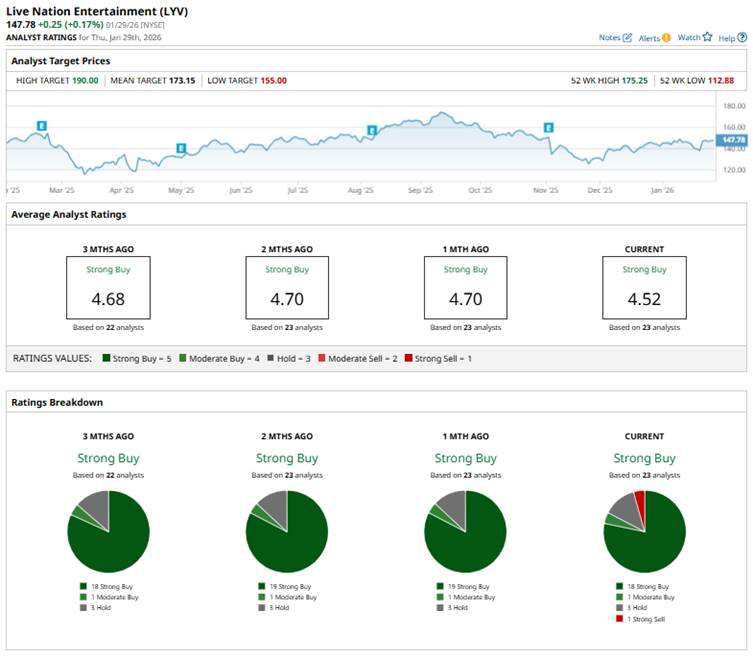 Live Nation’s mean price target of $173.15 suggests a 17.2% upside potential. Meanwhile, the Street-high target of $190 represents a notable 28.6% premium to current price levels.