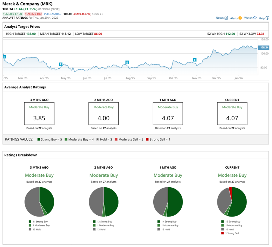 Among the 27 analysts covering MRK stock, the consensus is a “Moderate Buy.” That’s based on 15 “Strong Buy” ratings, one “Moderate Buy,” 10 “Holds,” and one “Strong Sell.”