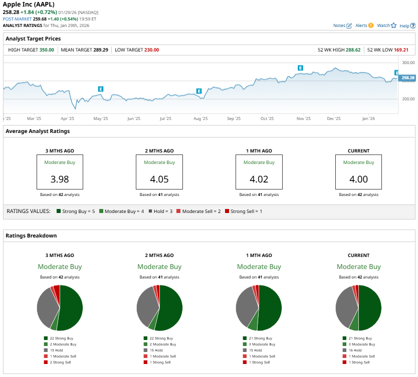 Apple stock spots a “Moderate Buy” consensus rating. Overall, Apple’s long-term growth prospects remain solid. However, investors should take caution in the near term.