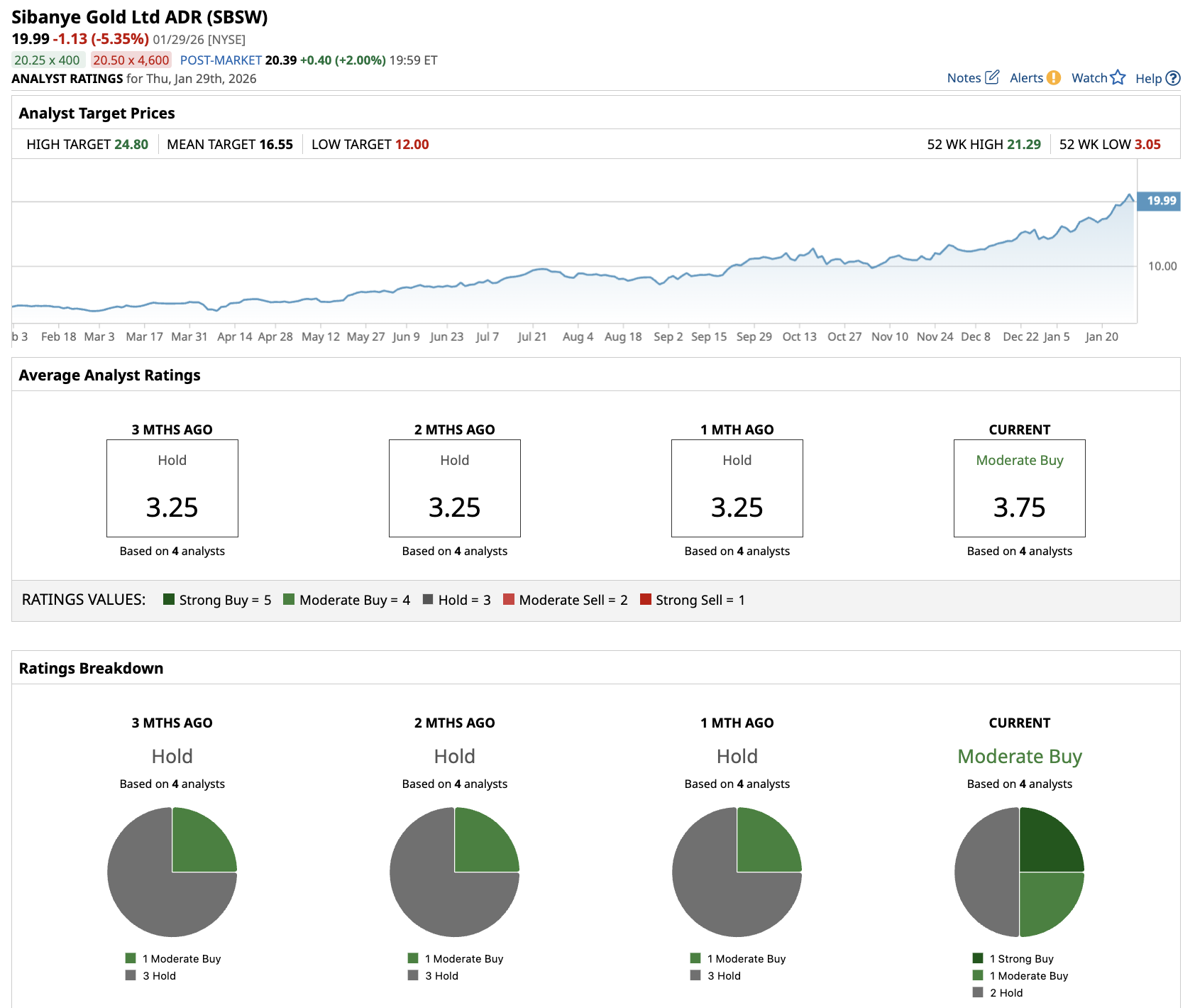 Out of the four analysts tracking SBSW stock, one recommends “Strong Buy,” one recommends “Moderate Buy,” and two recommend “Hold.” The average stock price target for the gold stock is $16.55, below the current price of about $20.