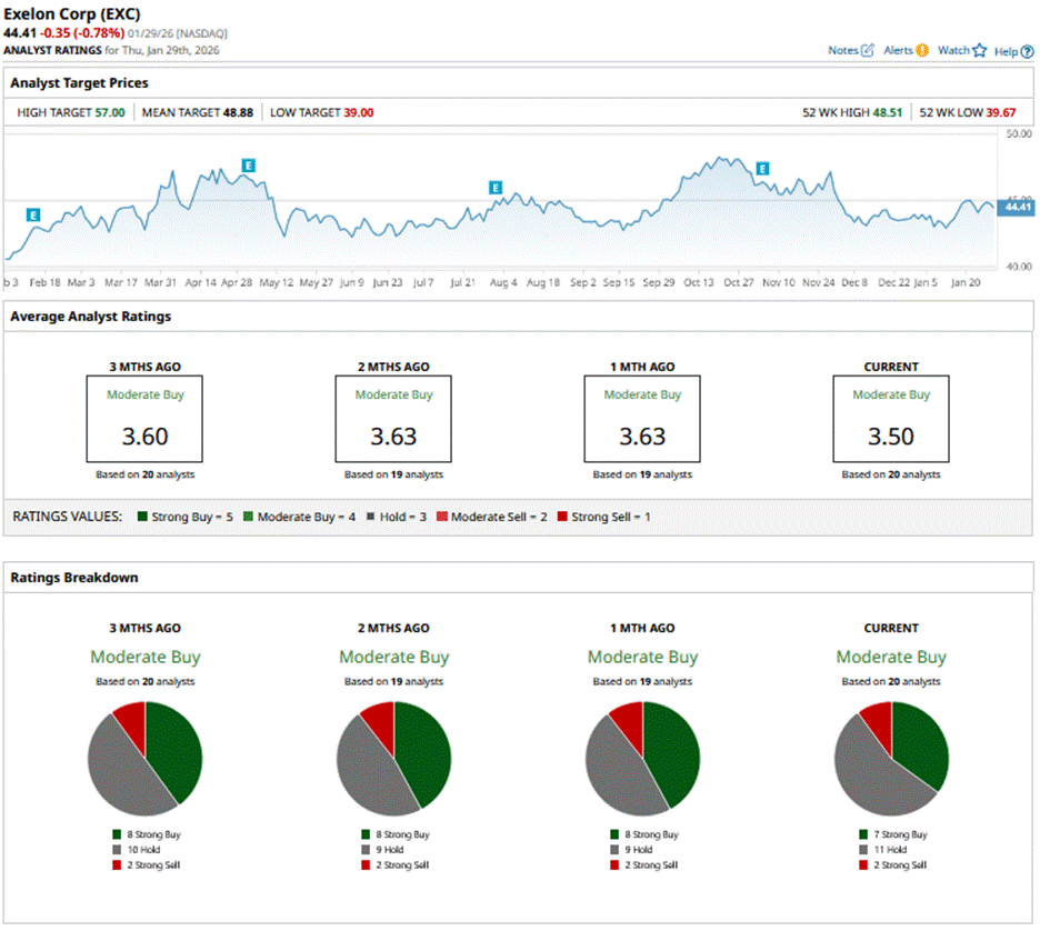 EXC has a consensus “Moderate Buy” rating overall. Of the 20 analysts covering the stock, opinions include seven “Strong Buys,” 11 “Holds,” and two “Strong Sells.”