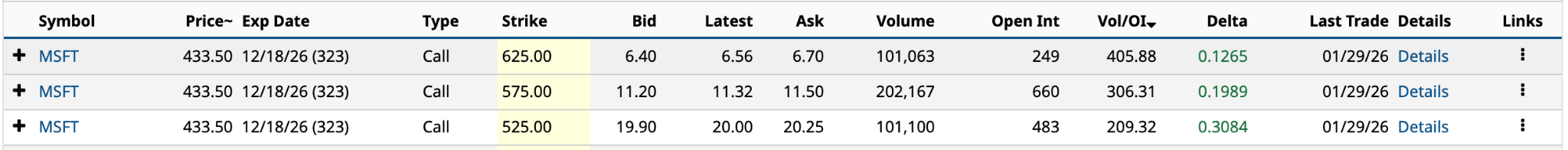 The strategy is a bet that the stock’s share price or implied volatility will make a sharp move higher by expiration. While I’m generally bullish about the mid- to long-term direction of MSFT stock, I’m not sure we’ll see a sharp move higher in 2026.