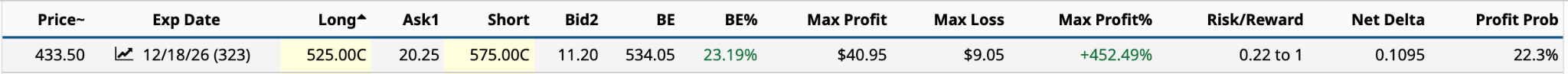 Of course, this explains the low profit probability of 22.3%, which is the likelihood that the share price at expiration in December is higher than the $534.05 breakeven [$525 long call strike price + $9.05 net debit].