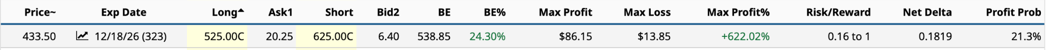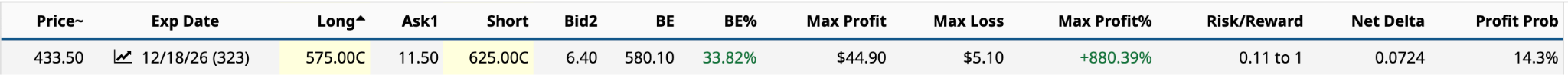 Lastly, we’ll use the $575 call as the short and two $625 calls as the long options.
