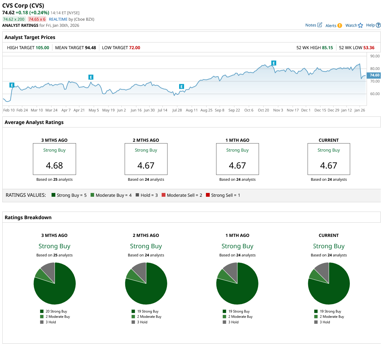 CVS’s consensus rating across 24 covering analysts stands at “Strong Buy,” and an average 12‑month price target of $94.48 implies roughly 27% upside.