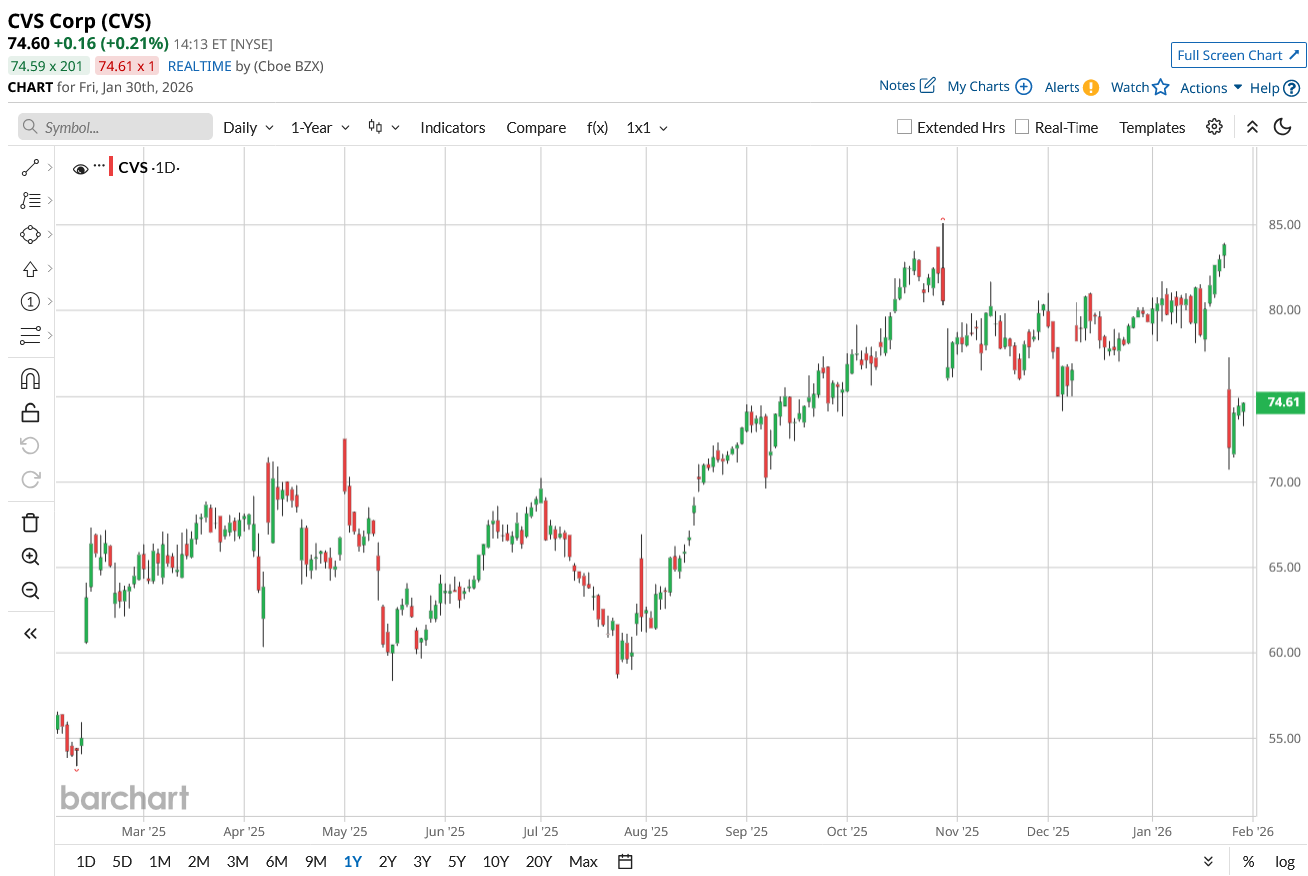 CVS changes hands at $74.60 as of Jan. 30, down 6%YTD but still up 31% over the past 52 weeks.