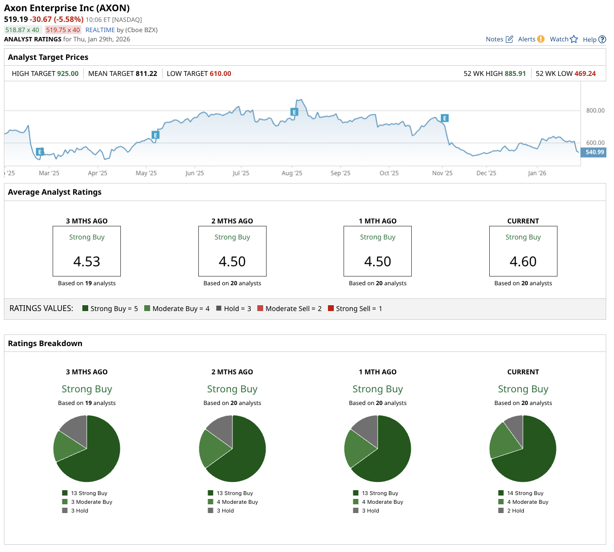 Sentiment toward Axon remains positive, with a consensus "Strong Buy" rating based on coverage from 20 analysts. The breakdown includes 14 "Strong Buy" recommendations, four "Moderate Buy" ratings, and two "Hold" ratings. No downgrades have been noted, but AXON stock's volatility has prompted caution amid high multiples. Consensus has held steady in recent months, buoyed by Axon's AI push despite 2025's underperformance.