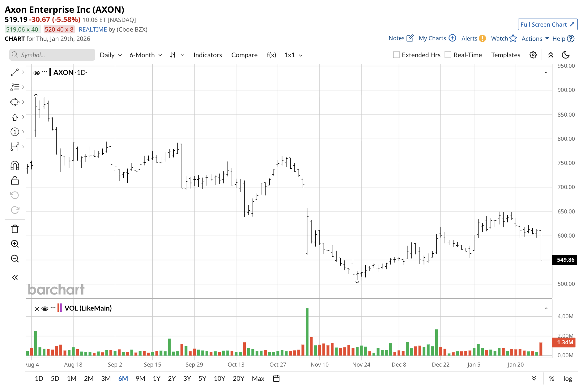 In 2026, AXON stock has declined 14% YTD, lagging the S&P 500's ($SPX) 1.3% gain. This follows a near-10% plunge on Jan. 28 after heavy trading volume of over 1.3 million shares and a 7% plunge on Jan. 29 after volume of 1.5 million shares. In 2025, the stock fell 4%, snapping a nine-year winning streak of positive annual returns and marking its first losing year since 2015. AXON underperformed the S&P 500's roughly 16% advance that year.