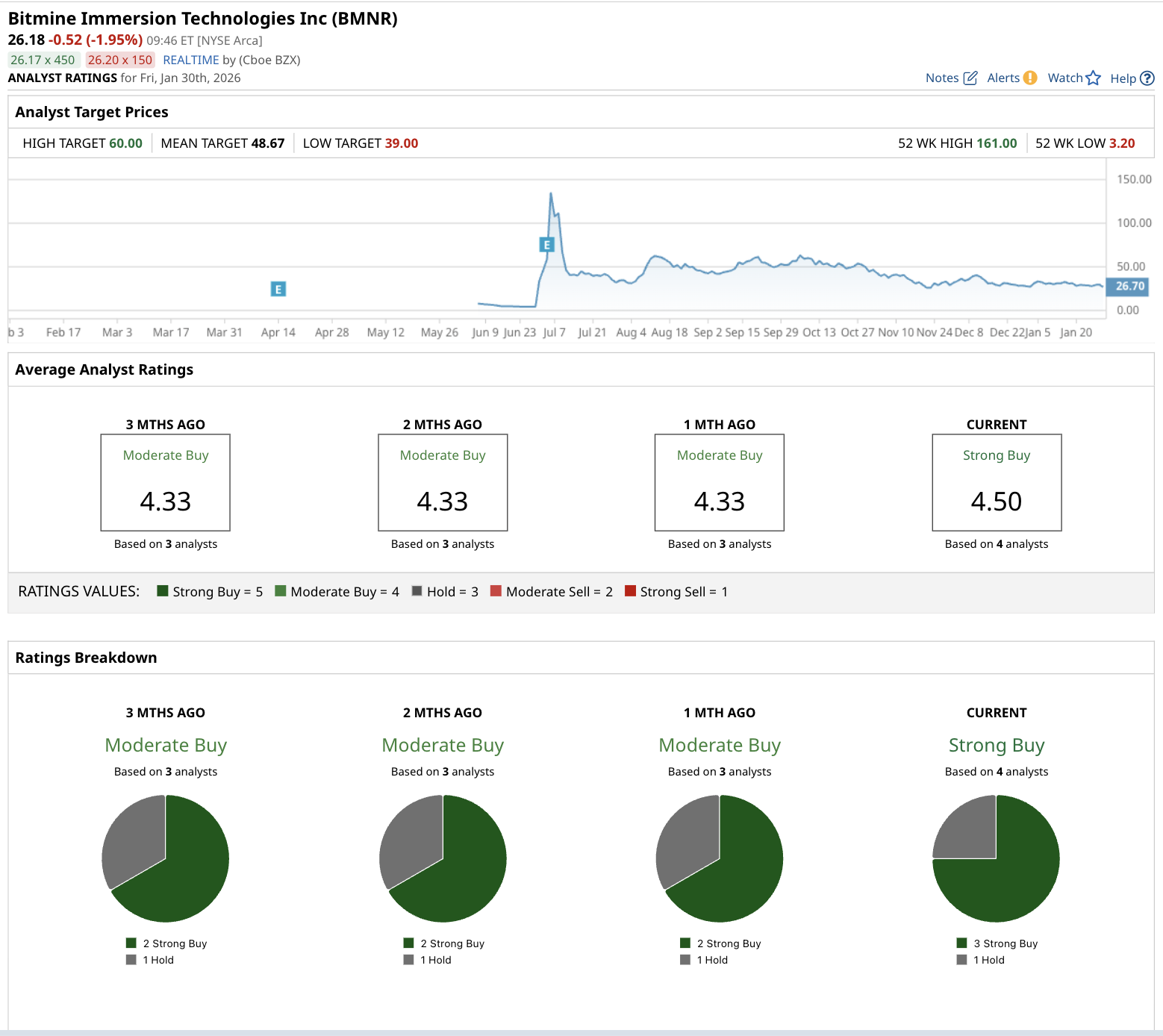 Consensus analyst ratings for BMNR, however, stand at “Strong Buy,” albeit based on coverage from just four analysts. Still, three analysts rate it a “Strong Buy” and one has a “Hold” rating.