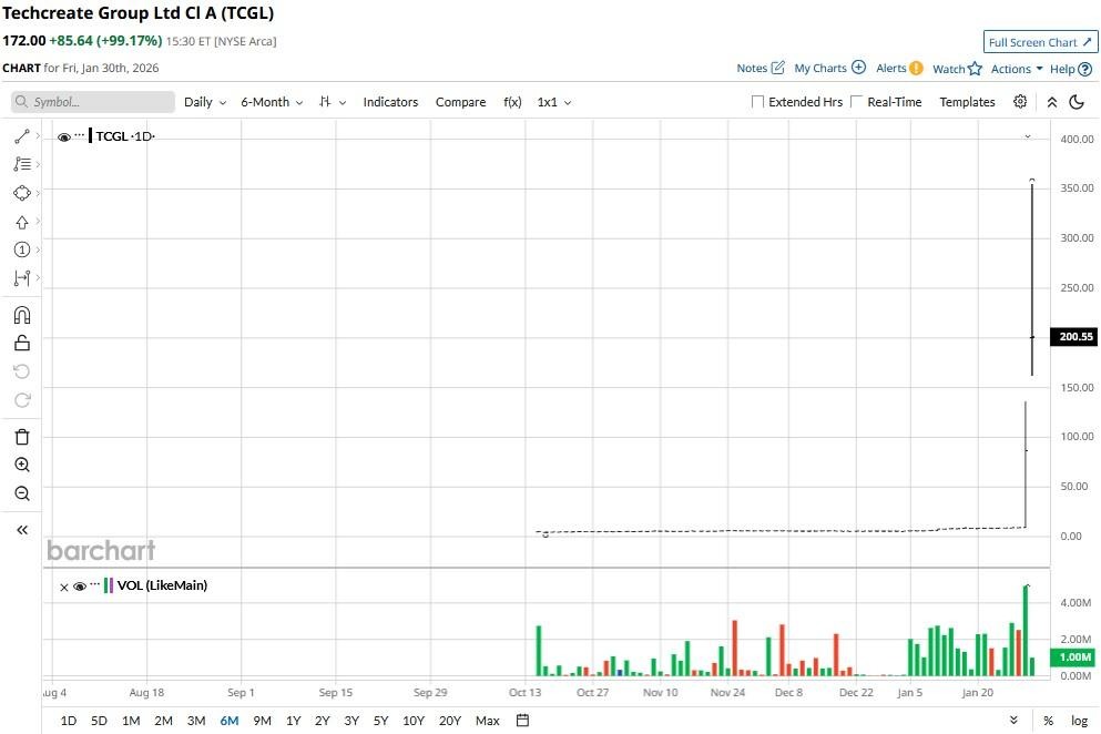 The tech sector has a new lightning rod: TechCreate Group (TCGL). After a quiet initial public offering (IPO) at $4, the stock ignited a monster rally this week, momentarily hitting an eye-watering $350. Driven by mysterious volume spikes rather than fundamental breakthroughs, TCGL shares are now up a mind-bending 3,765% versus the start of 2026.