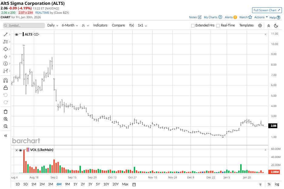 ALT5 Sigma shows mixed short-term performance amid high volatility. Over the past five days, the stock has dipped about 4%. However, the one-month gain stands strong at 88%, driven by fintech and biotech momentum.
