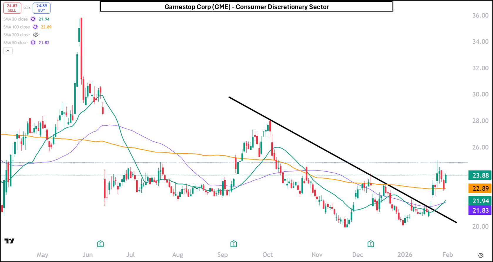 GameStop has recently shown signs of stabilization following a prolonged downtrend. The stock broke above its descending trendline and reclaimed the 50-day moving average, signaling a potential shift in short-term momentum. Price has also pushed back toward the 100-day moving average, suggesting improving participation after months of lower highs and lower lows. While the longer-term trend remains mixed, recent higher lows and improving moving-average alignment point to a developing recovery phase rather than continued deterioration.