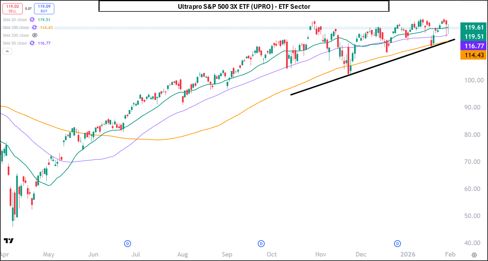 UPRO continues to trade in a strong uptrend, consolidating recent gains after a powerful multi-month advance. Price has held above the rising 50-day and 100-day moving averages, while repeated pullbacks have found support along the upward trendline and near the 200-day moving average, reinforcing the bullish structure. Recent action shows higher lows and tight consolidation near prior highs, suggesting the ETF is digesting gains rather than rolling over. As long as UPRO remains above trendline support and the 50-day average, the intermediate trend remains constructive, with upside momentum intact despite normal volatility.